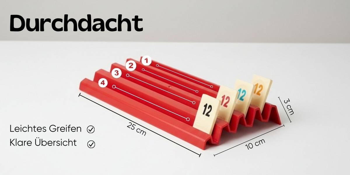 With its 25 cm length, the holder offers plenty of space for arranging tiles without feeling crowded. Made from high-quality injection-molded plastic, it is extremely durable, stable, and built for long-lasting performance. Despite its robustness, it remains lightweight and easy to handle. The wide slots make it comfortable to grip and reposition tiles, even for players with larger or less flexible fingers.
