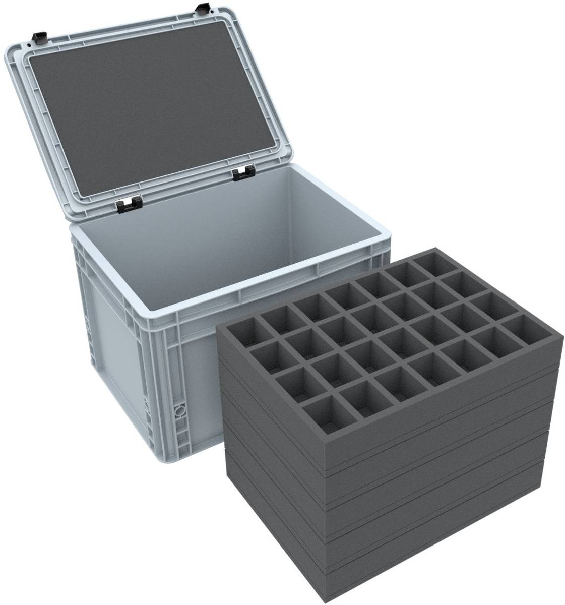 This large Feldherr Eurobox set brings order and protection to your tabletop collection. Five precisely fitting foam inserts provide space for up to 140 miniatures. Your figures are safely stored – at home, during transport, or at tournaments. Perfect for wargaming and board game miniatures from systems like Warhammer 40,000, Age of Sigmar, The Old World, Kill Team, BattleTech, Marvel Crisis Protocol, and Warcry.