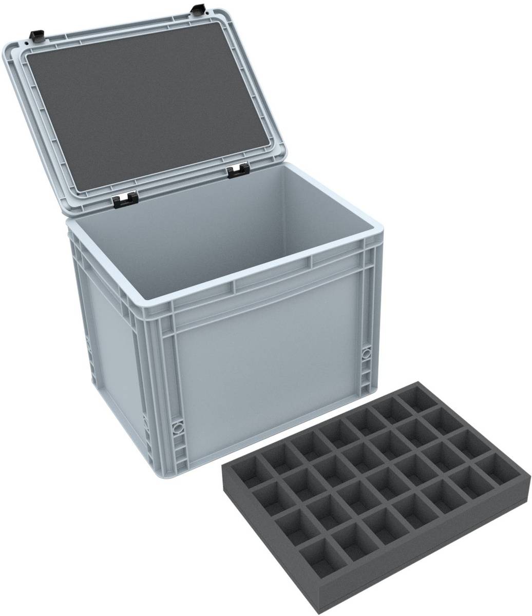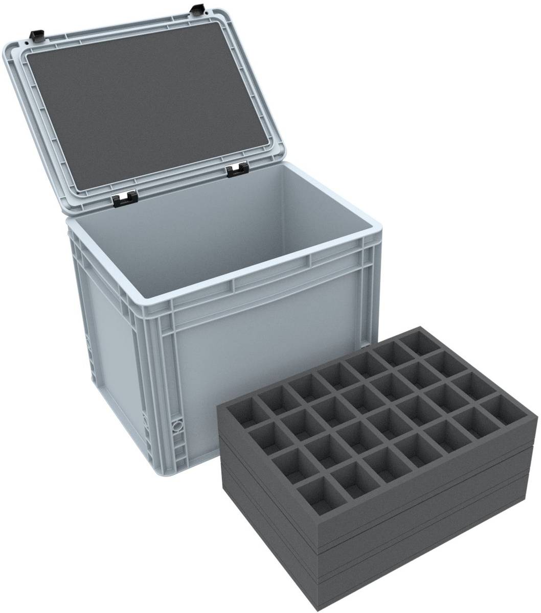 Eurobox resistente con inserciones de espuma personalizadas para 168 miniaturas de sobremesa a escala de 28 mm: protege sus figuras durante el transporte y las mantiene perfectamente organizadas.