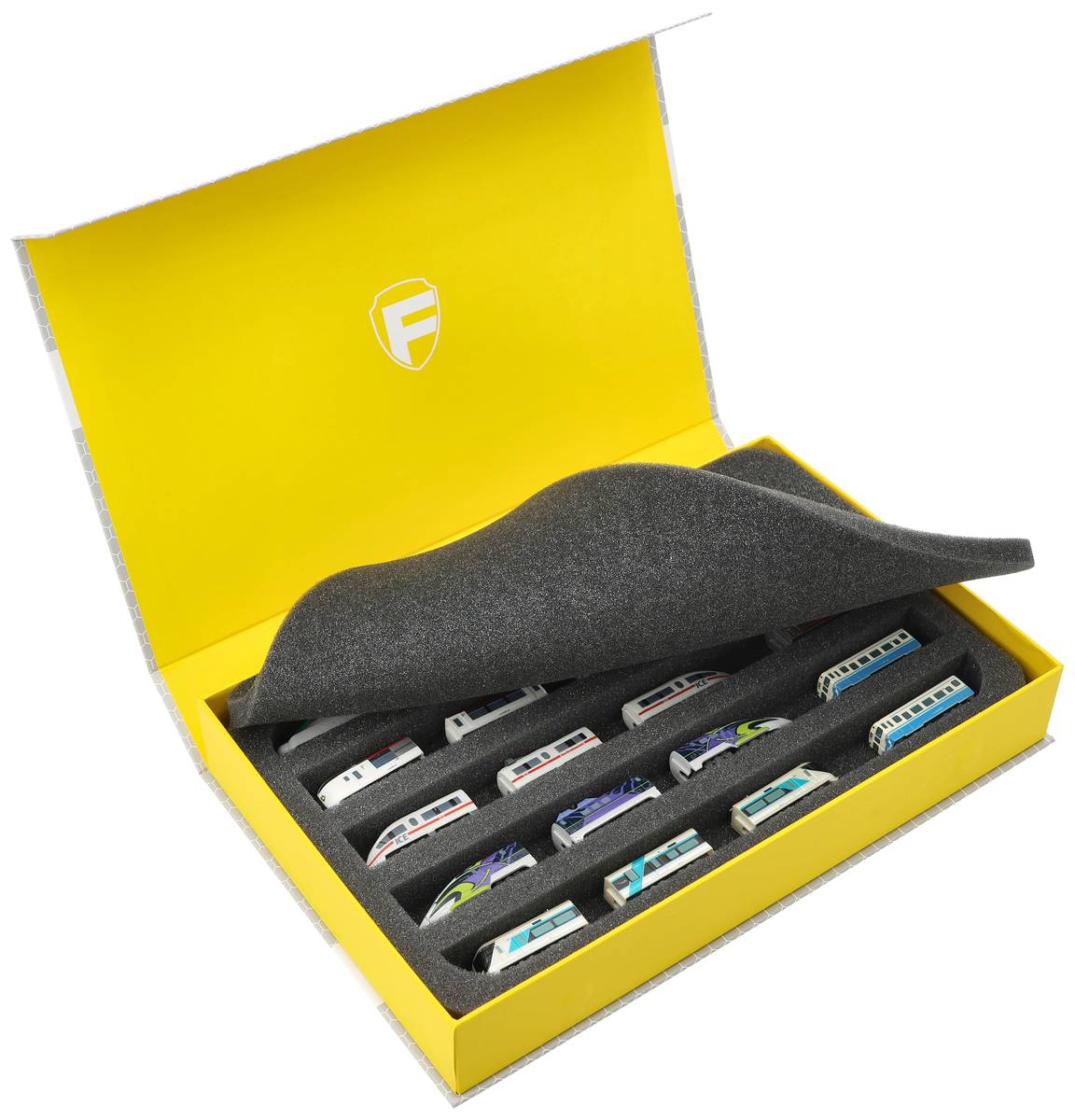 Tiny dimensions, big appeal - and now safely stored away: with this Feldherr Magnetic Box, including matching foam insert for Z-Shorty models in Z gauge, you can store your compact trains and cars neatly, clearly, and safely.