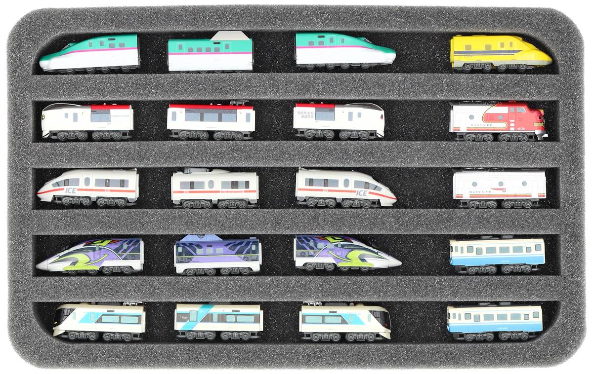 Five compartments, precisely tailored for horizontal storage of ROKUHAN's shortened Z-Shorty models, offer optimal protection for locomotives, cars, shells, and chassis. The horizontal position also makes the insert ideal for displaying your Z-Shorty collection.