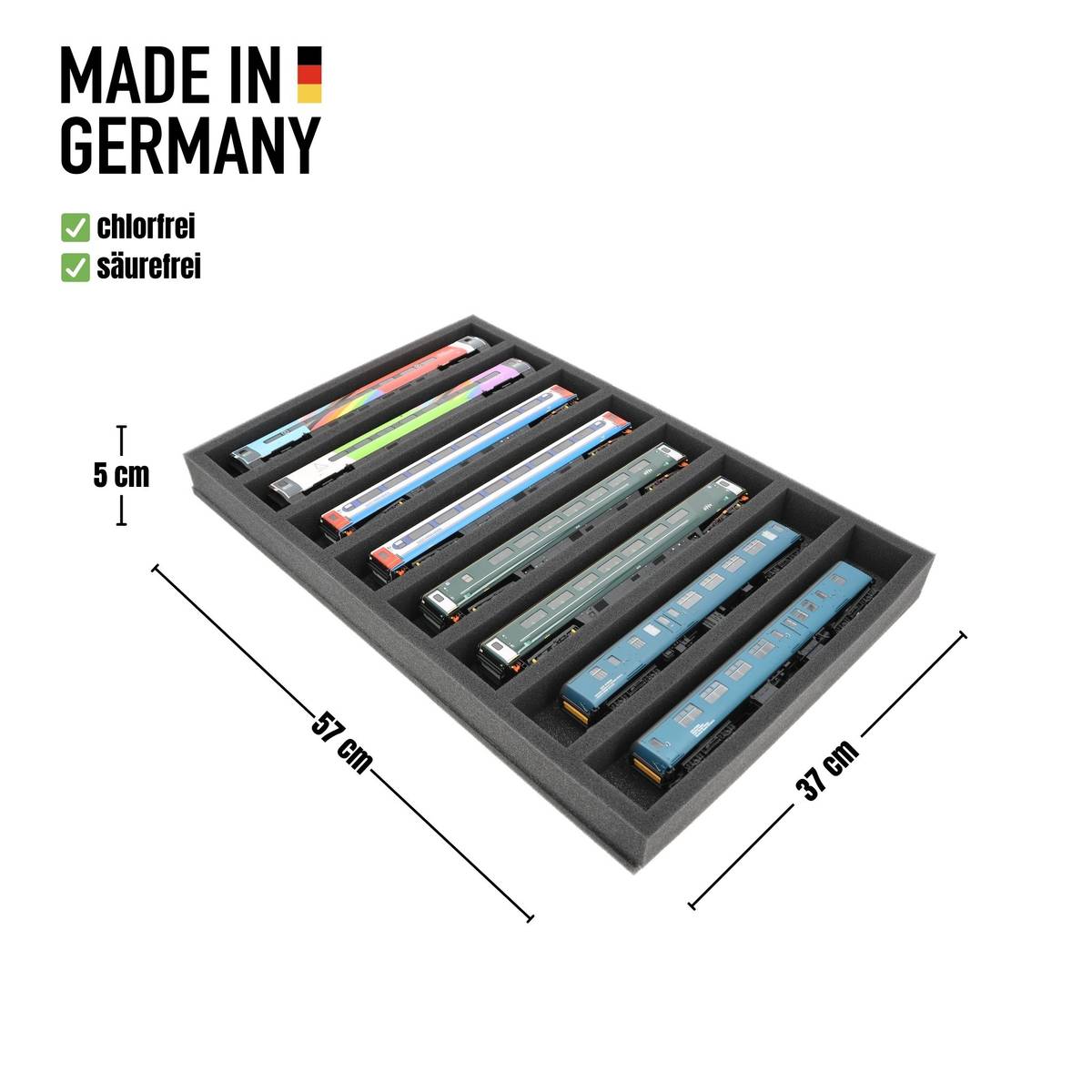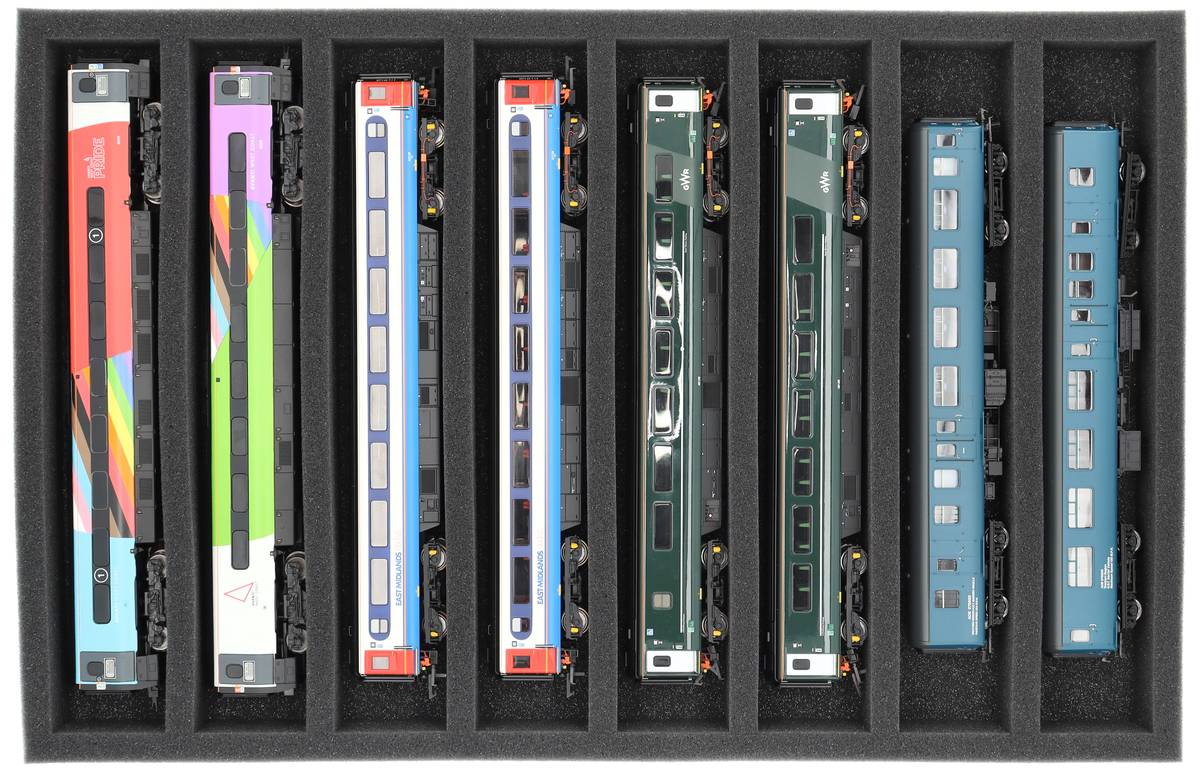 Une protection sûre pour vos trains à l'échelle 00 : L'insert en mousse Feldherr à 8 compartiments garde les locomotives et les wagons en position horizontale en sécurité et à portée de main - idéal pour le transport ou le stockage à l'abri de la poussière dans des Euroboxes de 60 x 40 cm.