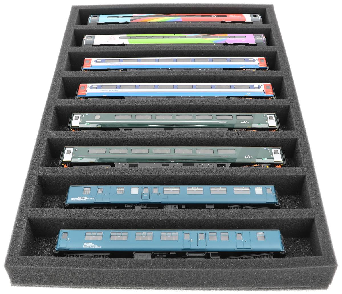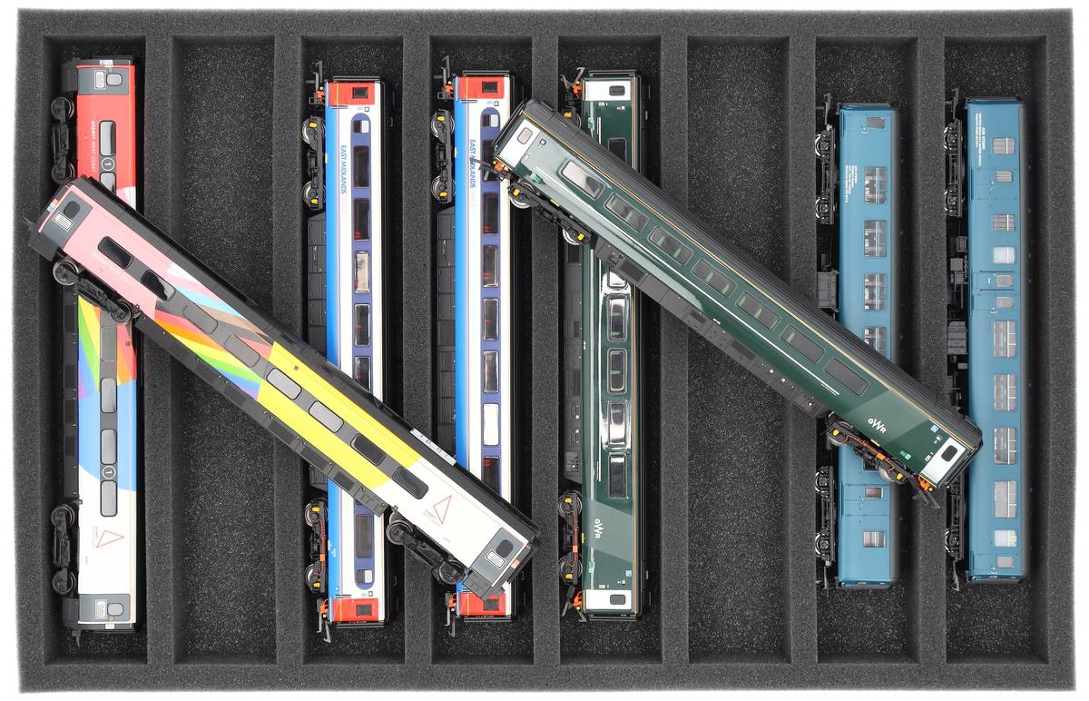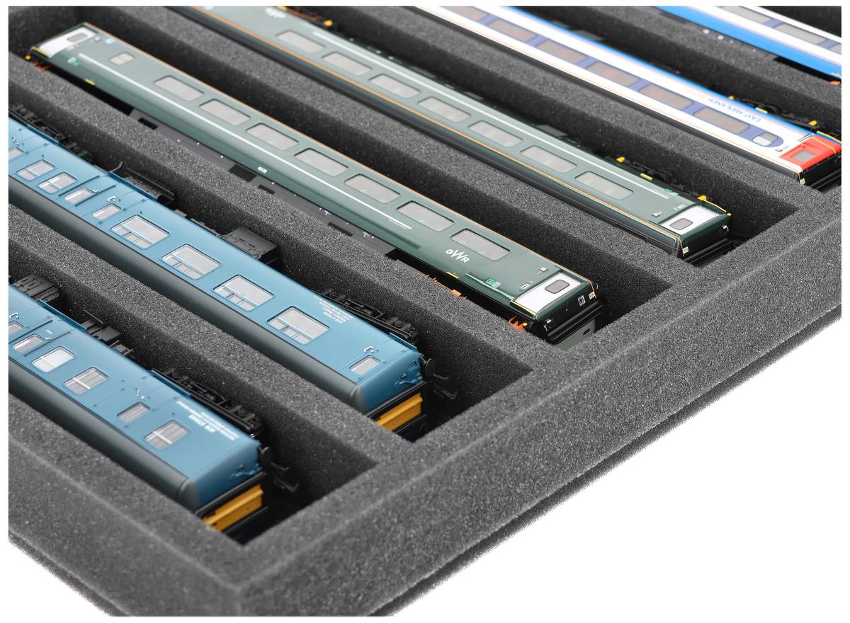 Que ce soit pour le transport lors d'expositions, de réunions de modules ou pour un rangement sûr sur des étagères à la maison, cet insert protège vos locomotives et wagons à l'échelle 00 de manière fiable. Les 8 compartiments maintiennent les modèles à l'horizontale et les protègent des chocs et des rayures.