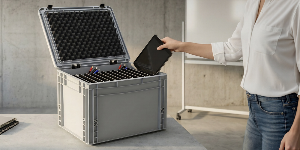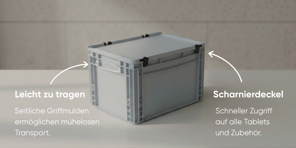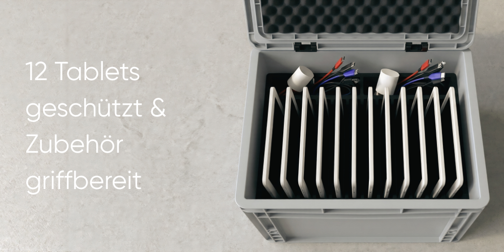 This small, handy transport box for 12 tablets is the little sister of our big 24-tablet box. This makes her even easier to carry. She fits into many lockable teacher's lockers.