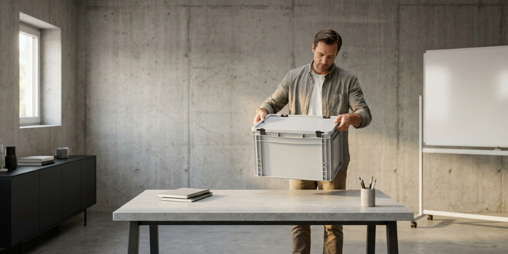 Just like bags, the transport box is mobile - it is robust - stable - and stackable. In contrast to post boxes or similar solutions, the Eurobox is equipped with a sturdy lid. This protects the contents from external influences such as dust, water or dirt. In addition, the Eurobox system allows the boxes to be stacked easily and safely.