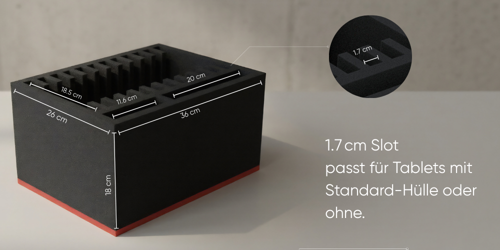 Thanks to the extremely robust, yet soft foam, the devices are excellently protected against mechanical impacts. At the same time, the material is so light that the insert has hardly any tare weight. The arrangement of the inserts makes it possible to sort everything clearly, and because of the red bottom you can see immediately if an iPad is missing.