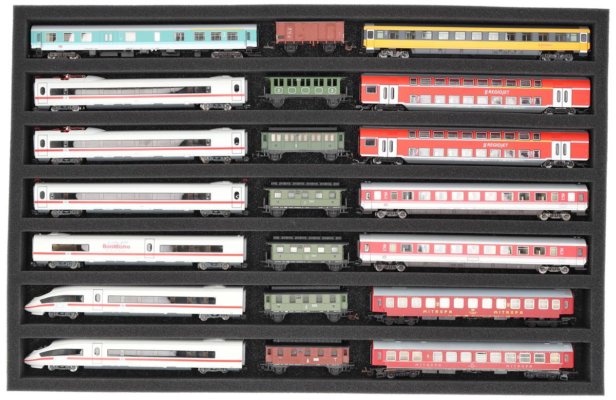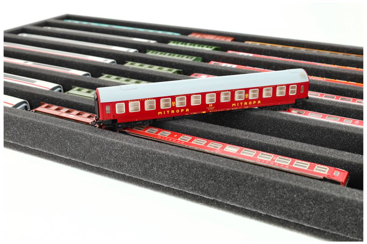 Whether for transport to exhibitions, module meetings, or safe storage on shelves at home, this insert keeps your TT scale locomotives and cars reliably protected. The 7 compartments hold the models horizontal and shield them from bumps and scratches.
