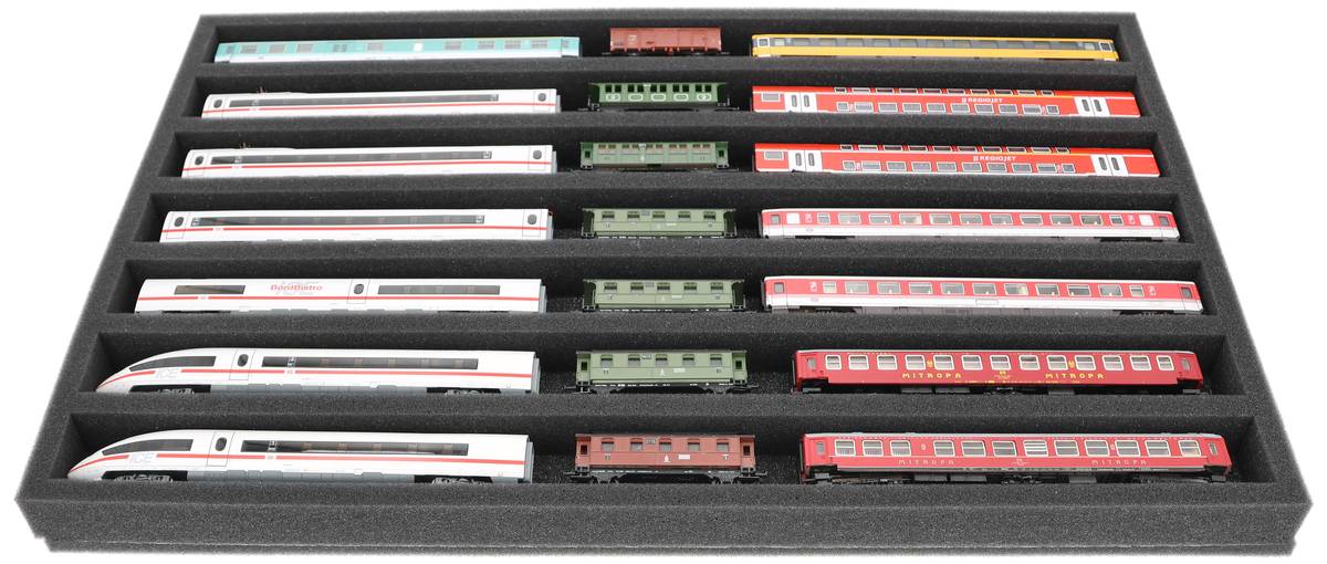 Secure protection for your TT scale model trains: The Feldherr foam insert with 7 compartments keeps locomotives and carriages in horizontal position safe and ready to hand - ideal for transport or dust-free storage in 60 x 40 cm Euroboxes