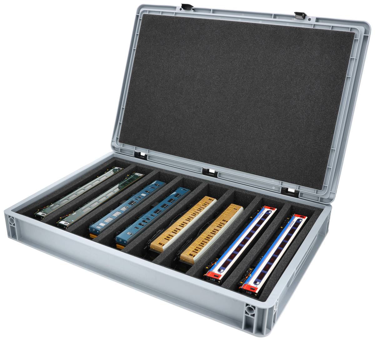 8 równej wielkości przedziałów (każdy o wymiarach ok. 320 x 55 x 40 mm) zostało specjalnie zaprojektowanych dla modeli w skali 00. W zależności od długości, lokomotywy i wagony mogą być umieszczone obok siebie. Dokładne dopasowanie zapewnia, że modele są bezpiecznie zamocowane i nie ślizgają się podczas transportu.